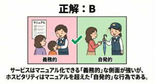 日常BLOG 【正解発表】昨日のホスピタリティ問題①、答えは…? こんにちは、採用担当です。 昨日の「ホスピタリティ検定 3級」への挑戦、ありがとうございました! 気になる正解を発表します。 答えは…… 👇 👇 👇 当たりましたか?🎉 松井産業では、単なるマナーだけでなく「相手の立場に立ち、相手のことを考えて行動する」ことを何より大切にしています。 こうしてクイズ形式で楽しく学びながら、社員全員で「おもてなしのプロ」を目指しています。 また次回の出題をお楽しみに!